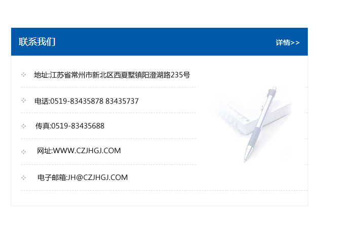 傳真:0519-83435688    郵編:213135    網址:WWW.czjhgj_com.shi-le-yuan.com    電子郵箱:JH@czjhgj_com.shi-le-yuan.com